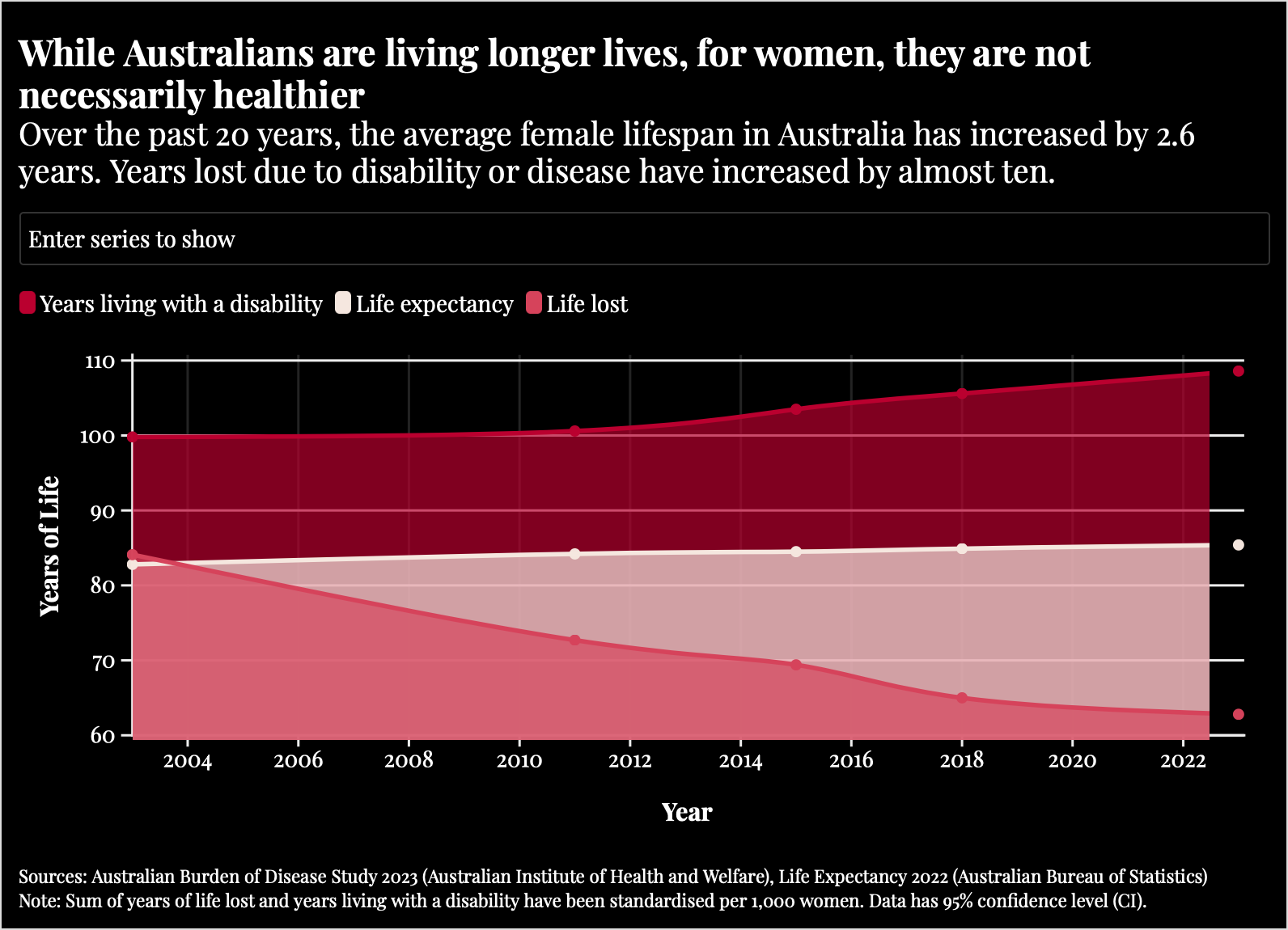 According to the Australian Bureau of Statistics, women are living longer, more fulfilling lives. Australian women live approximately 4.2 years longer than their male counterparts, are more likely to complete undergraduate or postgraduate tertiary education and as of February 2024, 60.9% of all women comprise Australia’s active workforce compared to 39.5% in 1978.